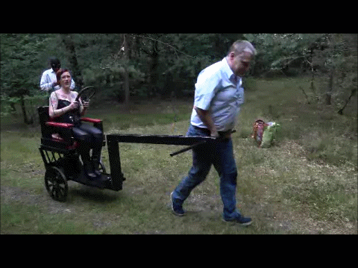 Nun wollte ich etwas Spaß haben, also schlug ich ein Spiel vor! Ich wollte ein Wettrennen machen: beide Sklaven mussten mich hintereinander auf einer Entfernung von 50 Meter so schnell wie möglich eine Strecke hin und zurückziehen. Der Sieger würde entsprechend eine Überraschung erhalten, der Verlierer allerdings eine Strafe. Oder bekommen doch beide eine Strafe, egal ob Gewinner oder Verlierer? :D Es ging also los: Wurmli war wirklich sehr schnell, Mad dahingehend hatte scheinbar nicht aufgepasst bis wohin er laufen muss und hat dann sogar eine "unbewusste" kurze Pause machen müssen! Wie ich also entschieden habe, verrate ich nun aber nicht ;)