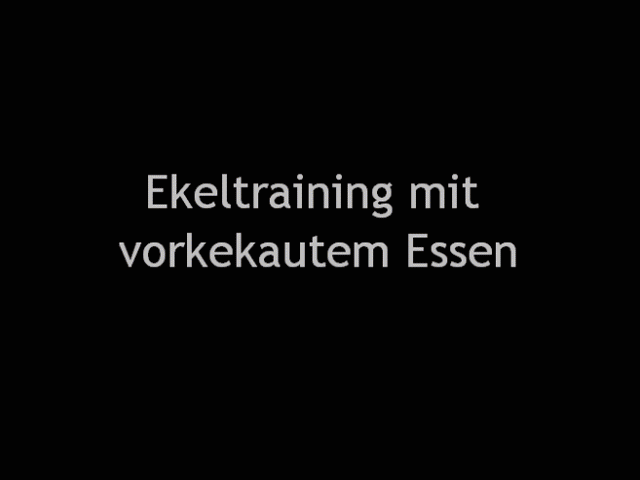 Das erste Ekeltraining für meinen Sklaven beginnt mit einer der einfachsten Sachen: von mir vorgekautes Essen für den Sklaven. Erst spucke ich es ihm auf einen Löffel. Die kleine **** weigert sich dann auch noch und wird mit Ohrfeigen bestraft! Dann kaue ich wieder Essen vor und spucke es auf den Boden, natürlich spucke ich auch noch mal auf das Essen. Er weigert sich immer noch, also muss ich ihn hart im Nacken packen und seinen Kopf zu Boden drücken. Ich merke, dass ich noch Brot zwischen den Zähnen habe und spucke auch die letzten Reste auf den Boden, die er dann nun endlich brav ableckt. Beim letzten Schritt kaue ich das Essen vor und spucke es ihm mitten in den Mund! Da kann er nichts mehr verweigern und muss nun alles freiwillig über sich ergehen lassen.