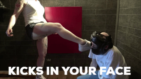 Ich liebe Facekicks, gerade dann, wenn ich weiß, dass mein Trottel nicht wirklich viel aushält und jeder Tritt in seine jämmerliche hässliche Visage ein harter Donnerschlag ist. Da bringt ihm auch sein dusseliger Kopfschutz nichts!